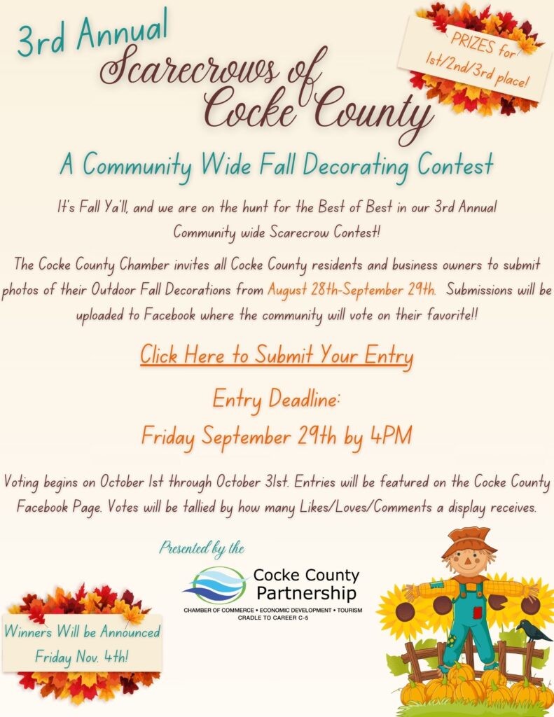 The Cocke County Partnership Chamber of Commerce is inviting all Cocke County businesses and homes to participate in a community scarecrow decorating contest. Winners will receive Gift card prizes and bragging rights!