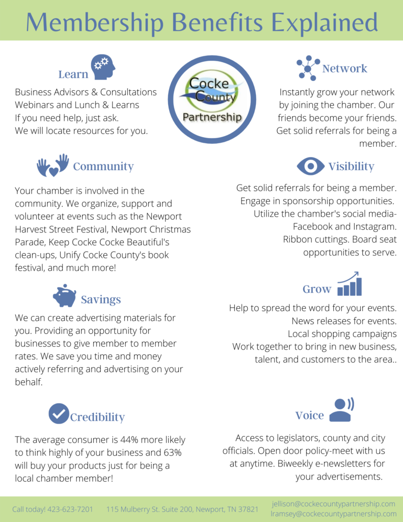 Promotion of your business throughout the county and region: The Chamber offers many opportunities for members to promote their business through print media and event sponsorship. Examples include relocation and visitor packets, brochure and business card racks located in the Chamber office, Chamber Member Breakfasts, Rhythm on the River Concert Summer Series, and the Newport Harvest Street Festival.